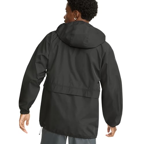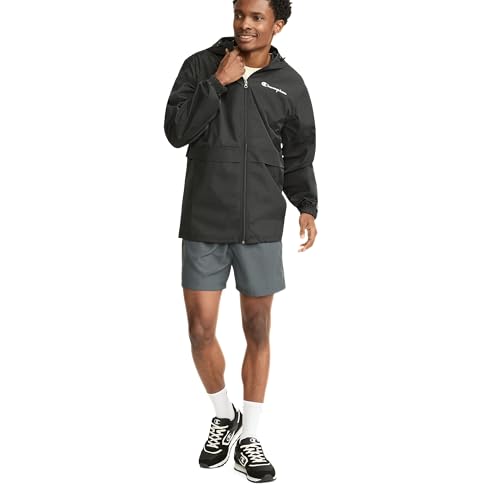 This lightweight men’s rain jacket, resistant to both wind and water, is your ideal companion for outdoor adventures. It’s equipped with a full-zip front, a scuba-style collar, and a hood secured by a bungee cord. The jacket’s roomy design allows for easy layering, even over your favorite Champion sweatshirt. It boasts smart features like rain flaps at the front and back, elastic cuffs to keep out wind and rain, and an adjustable bungee cord hem for a custom fit. It also has front pockets for essentials and a recognizable Champion script logo on the left chest.