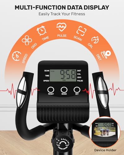 Intelligent & Digital: Track your progress in real-time with the digital display, which shows TIME, SPEED, DISTANCE, CALORIES, PULSE, SCAN, and ODO. Stay motivated with handy metrics and use the device holder to watch videos or follow training routines—making workouts fun and distraction-free.