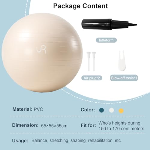 Safety and Comfort: The exercise ball is crafted from PVC material, thus free of BPA & heavy metals, safe for pregnant women and children. 55cm diameter (21.6″), It is strictly weight tested and can resist up to 330 lbs.