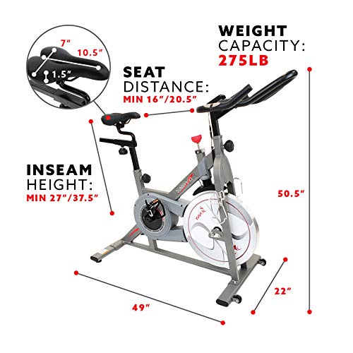 Specification: Sunny Health & Fitness Indoor Cycling Exercise Bike w/Pulse Sensors & 4-Way Adjustable Seat, Stationary Home Cardio Training Machine w/Micro-Adjustable Magnetic Resistance for Intensive Cardio Session