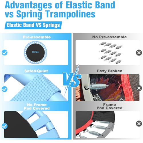 Superior Bungee Bands: Thicker, wider bungee bands offer a smooth, quiet workout and protect your knees and back. Our trampoline doesn’t have frame flat pads, but it’s safe and won’t break and shift. You can use it with confidence.