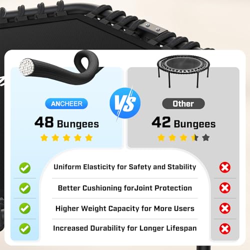 【Upgraded Model 48 Super Strong Bungee Cords】 ANCHEER’s hexagonal trampoline bouncing mat frame can carry more bungee springs. Replacing the stiff, squeaky metal springs, it can fully absorb the impact when landing. Compared with metal springs, it delivers an easier, deeper, smoother and healthier jumping experience without any negative impact on joints and ligaments.