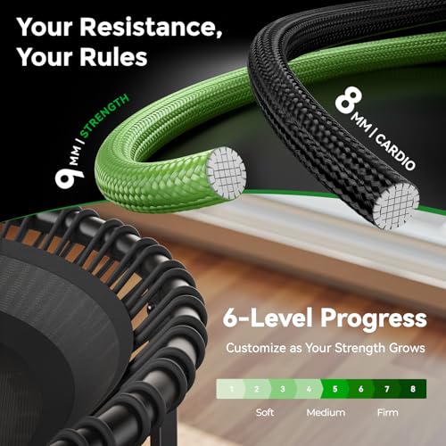 Dual Bungee System, 6-Level Adjustable Tension: Equipped with two sets of bungee cords – 8MM (38 cords for cardio endurance) and 9MM (22 cords for explosive strength). Users can freely combine cords to customize the tension level, perfect for different training styles and multi-user household workouts