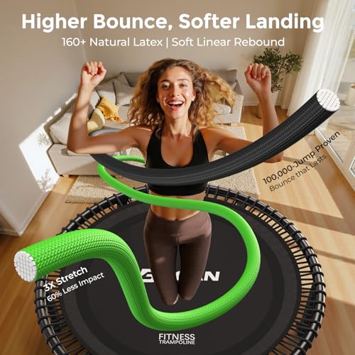Higher Rebound, Softer Landing: Built with natural latex bungee cords, each cord contains 160+ latex filaments and has passed 100,000 jump durability tests, delivering 3× stretch while reducing impact by up to 60% for low-impact, joint-friendly workouts—perfect for anyone seeking a safer, smoother fitness trampoline experience