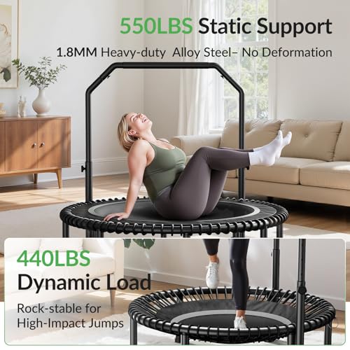 BCAN 450/550LBS Mini Rebounder Trampoline for Adults with Bar, Fitness Trampoline with Bungees, Adjustable Handle, Stable & Quiet, Indoor Outdoor, Whole-Body Workout & Relaxation at Home-40IN/48IN