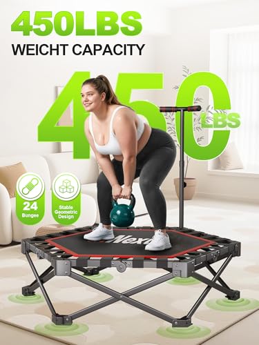 FitNexus 42″ Foldable Mini Trampoline- 450lb Capacity Fitness Rebounder w/3-Level Adjustable T-Bar, Adults Workout Trampoline, Non-Slip Pad | Foldable Design for Home/Gym
