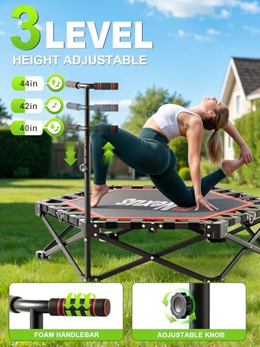 【3-Level Adjustable T-Handle】Ergonomic foam grip for comfort and control. Customize your workout with 3 height settings (40.5″/42.5″/44.5″) to target shoulders, glutes, legs on your rebounder trampoline for adults, engaging the entire body.