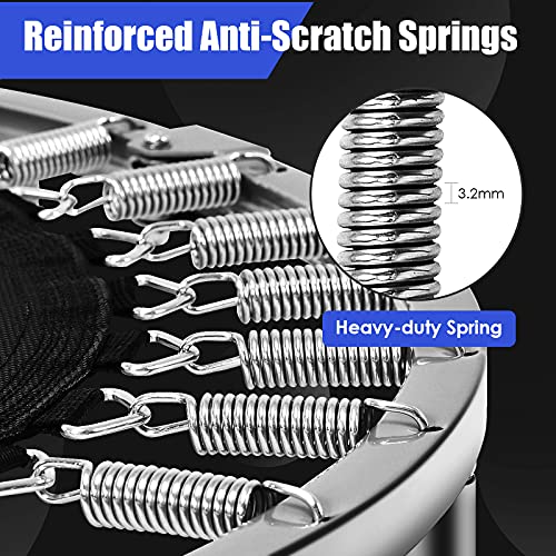 【High Bounce Performance】There are 32 springs with safety rounded buckle,which not only disperse the bouncing pressure but also is anti-dislodging and anti-scratch. Meanwhile, the folding trampoline has 6 thick steel legs, which greatly enhance overall weight capacity up to 330lbs.
