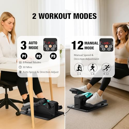 【2 IN 1 & AUTO OR MANUAL MODES】The pedal exerciser can be used in active mode without being plugged in, utilizing leg power for manual workouts. When plugged in, switch to electric mode where you can choose between automatic modes (P1-P3) or manual mode. In manual mode, adjust the speed (1-12 levels) and move the pedals forward or backward as needed.Effectively exercise multiple muscle groups.Note: Designed for seated use