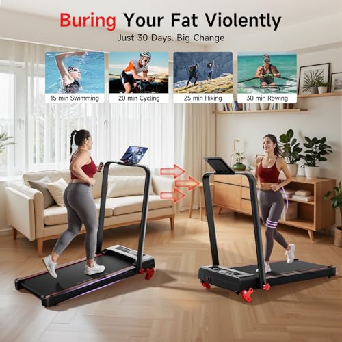 【Compact and Lightweight Design】This compact treadmill weighs only 43 lbs, The folded height is only 5 inches, you can put it under the couch, bed or cabinet. Treadmill is designed to be compact and lightweight, making it easy to store in small spaces such as apartments or dorm rooms.