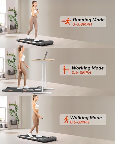 2 in 1 Walking Pad: Stay active throughout the day with our 2-in-1 portable treadmill. The speed of walking pad is 0.6MPH-3.8MPH. Greatl for working while walking or jogging, this under desk walking pad lets you maintain your fitness routine