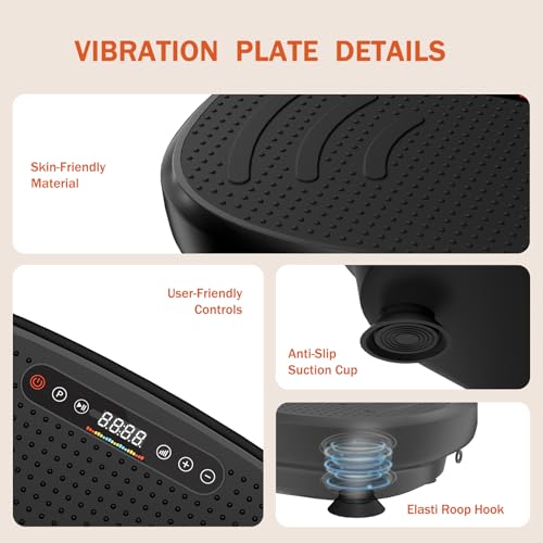 SAFE & DURABLE VIBRATION PLATE MACHINE Built with durable ABS material and featuring 4 anti-slip suction cups, our vibrating plate exercise machine stays firmly in place during workouts, reducing noise and minimizing disruptions. It supports up to 330 lbs, offering a reliable choice for daily use. Ideal for supporting rehabilitation, stress relief, and s reduces joint tension