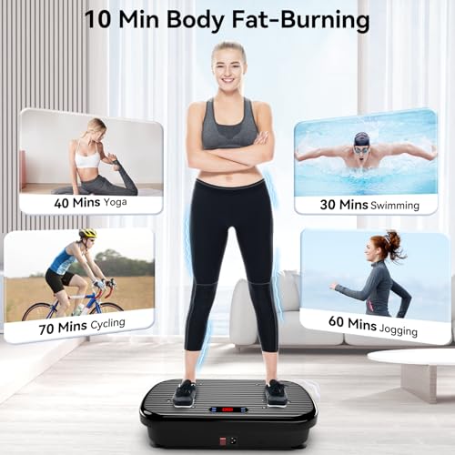 【FEATURE-RICH AND EFFICIENT】Vibration plate exercise machine provides 5 workout modes, manual mode with adjustable speed (1-180) and 4 smart modes(P01-P04). Vibration plate has a maximum weight capacity of 400 pounds(The internal load-bearing iron frame has been enlarged and thickened by 5mm, making it extremely sturdy). Comes with 2 resistance training bands to workout both upper and lower body. 10 minutes workout per day to increase bone mineral density, relieve and reduce stress levels
