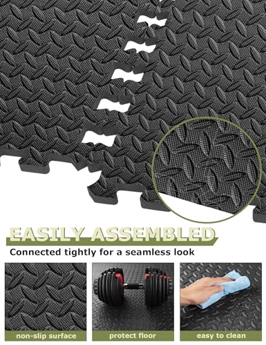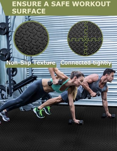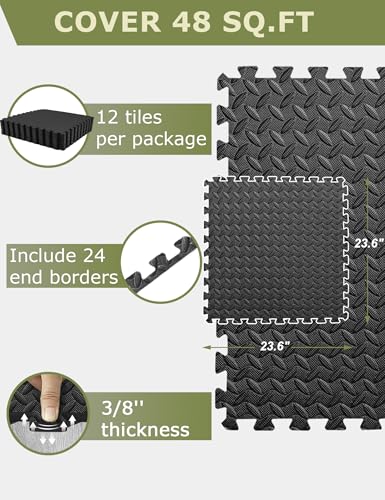 Gym Floor Mats Cover 48 SQ. FT: Each foam floor tile measures 23.6 inches x 23.6 inches x 3/8 inch (600mm x 600mm x 10mm). Package includes 12 BLACK interlocking foam tiles and 24 end borders for a seamless appearance. Gym flooring cover up to 48 sq.ft of floor space, making it a perfect workout and training accessory.