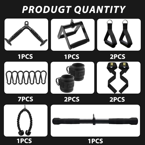 WHAT IS IN THE BOX – 1 * V-Shaped Bar +1 * Straight Rotaing Bar + 1 * V Handle with Rotation + 1* Nylon Braided Tricep Rope+2 *Ankle Straps+ 2*Cable Machine Handles+ 7*Snap Hooks+ 2*Lifting Wrist Straps.