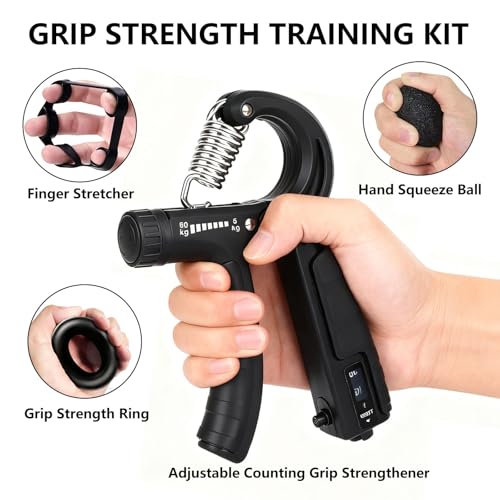【5-in-1 GRIP STRENGTH TRAINER KIT】Maximize Your Hand & Forearm Workout This complete hand gripper strengthener set includes everything you need: two (2) adjustable hand grippers with smart counter, one (1) finger resistance band strengthener, one (1) grip ring, and one (1) stress relief grip ball. This ultimate grip strength trainer kit targets every muscle in your hands, wrists, and forearms for comprehensive strength building and rehabilitation.