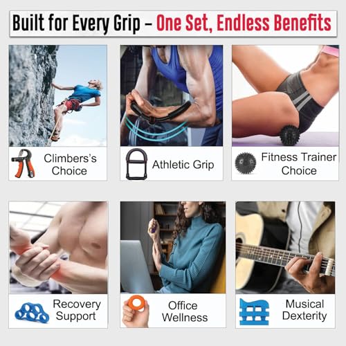 ✅ 12-Piece Complete Hand Strengthening Kit Everything you need for a full hand, wrist, and forearm workout. Includes hand grip strengthener, finger stretcher, finger exerciser, grip ring, therapy ball, counting grip, grip-enhancing rings, and more — all packed in a compact carry bag.