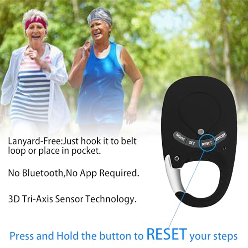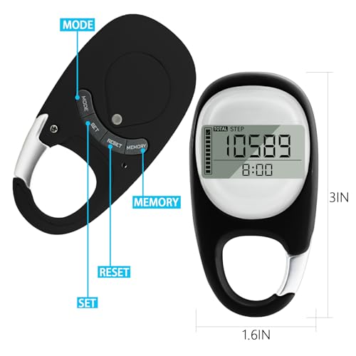 Specification: 3D Pedometer with Carabiner, Accurate Step Tracker, Step Counter, Distance Tracker, 7 Days Memory, Calorie Counter for Men Women Kids Seniors