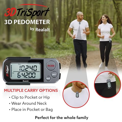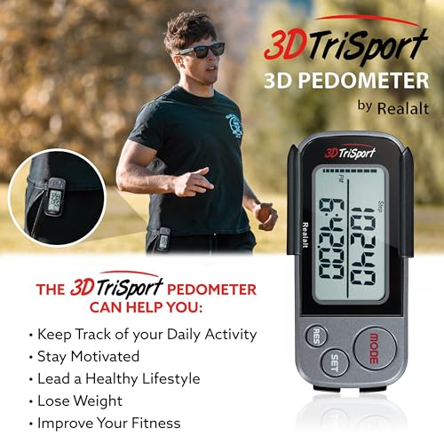 Specification: Realalt 3DTriSport Walking 3D Pedometer with Clip & Strap, eBook Included 30 Days Memory Accurate Step Counter, Walking Distance Miles/Km, Calorie Counter, Daily Exercise Time Monitor