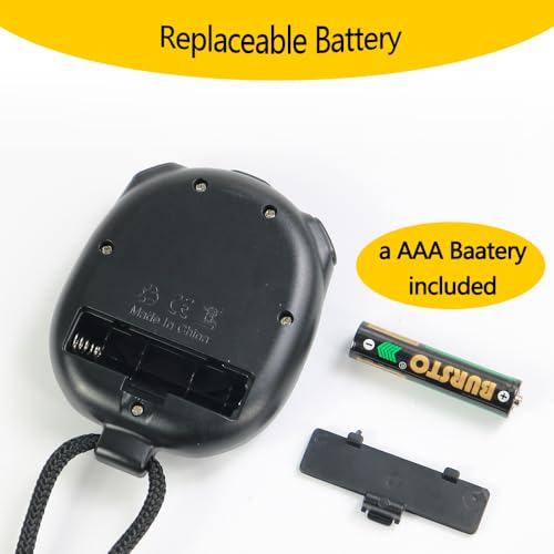 【On/Off with AAA Battery】: This stopwatch uses one standard AAA battery which is very easy to find and install. The simple stopwatch has on/off function with one AAA battery(Included). Hold on the ON/OFF button 5 seconds to turn it on/off