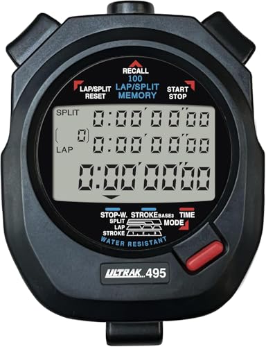 Ultrak’s most popular stopwatch! The Ultrak 495 is a professional quality stopwatch for use in critical timing events. Dual split, 100 memory lap and cumulative splits. Continuous display of event time. Memory recall during operation. Fail-safe switches for accurate timing. Water resistant design. Large, easy to read 3 row display. Measures up to 10 hours. Long lasting Lithium battery. Five year warranty.