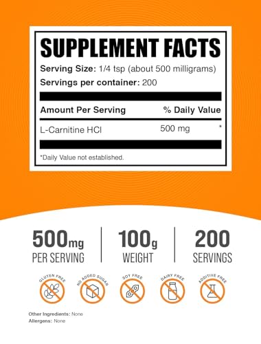 Specification: BulkSupplements.com L-Carnitine HCl Powder – Carnitine Supplement, Carnitine Powder, L-Carnitine 500mg – Unflavored & Gluten Free, 500mg per Serving, 100g (3.5 oz) (Pack of 1)