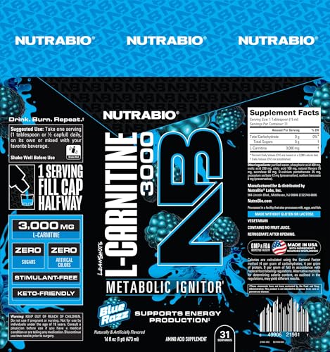 Specification: NutraBio – L-Carnitine Liquid Shots – 3000mg, (Blue Razz) – 10mg of Vitamin B-5 – Zero Carbs & Sugars – Energy Production – Muscle Recovery