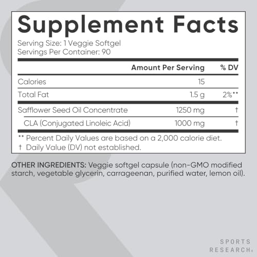 Premium Quality | Sports Research Vegan CLA comes from pure, premium-quality, non-GMO safflower oil obtained from certified sources and standardized to a high potency of 80% active CLA. Each 1250 mg softgel contains 1000 mg of active CLA.