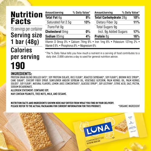 Specification: LUNA Bar – LemonZest Flavor – Gluten Free Snack Bars – Non-GMO – Protein Bars – Made with Organic Oats – Value Pack (12 Pack)