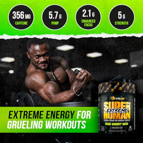 ALPHA LION Superhuman Extreme High Stim Pre Workout Powder, Beta Alanine, L-Taurine & 356mg Tri-Source Caffeine for Sustained Energy, Nitric Oxide & Citrulline for Pump (21 Servings, Sour Gummy Bear)