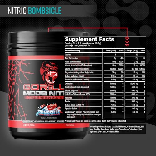 Specification: Gorilla Mode Nitric Upgraded Stimulant Free Pre-Workout – Best Tasting and Most Effective Stimulant Free Pre-Workout/Massive Pumps · Vasodilation · Power / 768 Grams (Bombsicle)