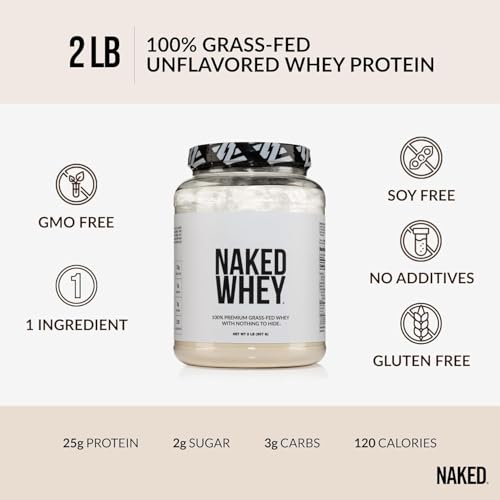 NAKED Whey 2LB 100% Grass Fed Whey Protein Powder – Only 1 Ingredient, Unflavored Whey Protein, Undenatured, Gluten Free, Soy Free, No GMOs, No Preservatives