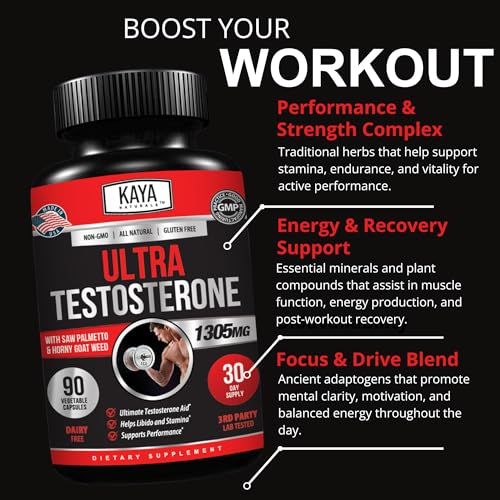 Kaya Naturals Ultra Testosterone – Men’s Testosterone Booster with Tongkat Ali, Horny Goat Weed, Tribulus – Natural Workout Supplement for Energy, Stamina, and Strength Booster – 90 Count