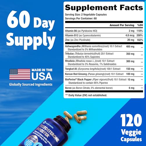 Specification: Testosterone Booster Supplement for Men – Male Enhancing Test Boost – Ashwagandha, Tongkat Ali, Rhodiola, Tribulus, Vitamin D3, B6, B12 – Workout, Muscle Builder, Strength, Energy, Performance – 120ct