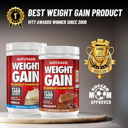 AWARD WINNING FORMULA: Our Naturade Weight Gain drink mix, honored as the Best Weight Gain Product at the 2023 Vity Awards, delivers a substantial 1600 calories per Servings. Packaged in a 20.3-ounce container with 12 Servings, it ensures a durable supply for your nutritional needs. Our award-winning, stimulant- and steroid-free product may supports a natural weight management journey. Embrace the delicious chocolate flavor for an enjoyable and satisfying experience with every sip.