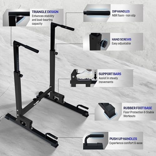 ENHANCED STABILITY & SECURITY DESIGN: With robust triangular welding, our dip parallel bars boast increased load bearing capacity; Double hand screws & Non-slip rubber base ensure reduced shaking for comfortable & stable workout experience