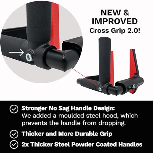 New & Improved CrossGrips 2.0: Features a moulded hood to prevent handle sagging, thicker steel, black powder-coated finish, and upgraded non-slip grips for safer, stronger workouts.
