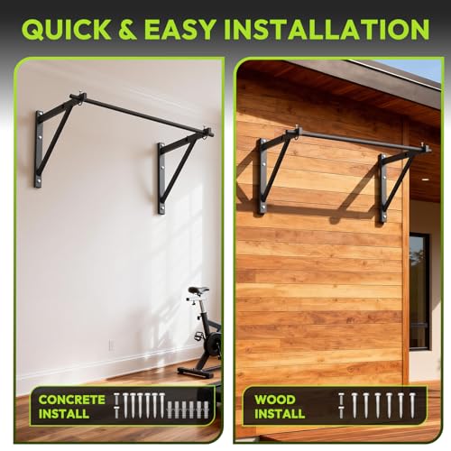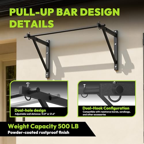 Indoor/Outdoor Use: The pull up bar wall mounted features a powder-coated surface finish with exceptional rust resistance and long-lasting durability, ensuring it can withstand heavy-duty use in both indoor and outdoor environments.