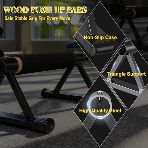 Durable & Sturdy: Solid wooden bars paired with a reinforced metal triangular base provide rock-solid stability with no wobble. Perfect for high-intensity push-ups, handstand training, or core workouts, offering reliable support so you can focus on pushing your limits