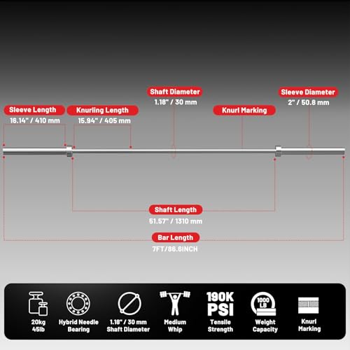 Specification: 7FT Olympic Barbell 45 lb Barbell 2 INCH 1000lbs/1500lbs Capacity Olympic Bar with Moderate Knurling For Squats Curls Deadlifts