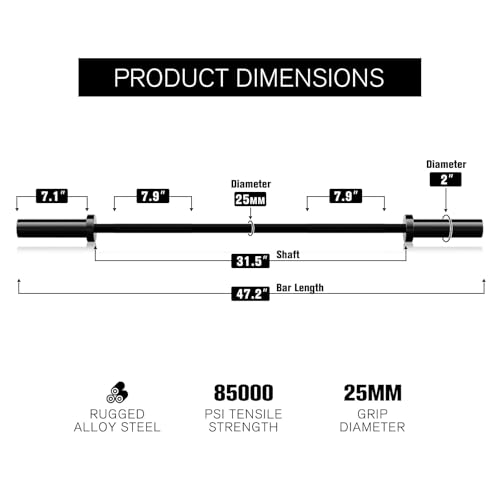 RitFit 4ft Olympic Bar has a bar shaft diameter of 25 mm, and a length of 1.2 meters (4 feet). Needle bearings allow for a smoother, quieter spin and a more reliable turnover at maximum loads.