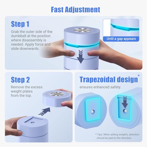 [ Upgraded Adjustment Structure, Safe and Not Easy to Fall Off ] Hand weights features an upgraded V-shaped dovetail groove structure, which allows you to quickly remove the weights set by hold and press the second weight and then move away the outermost weights., and is easy to adjust without snagging. This dumbbell is equipped with a safety locking device, the weights will not fall off, ensuring safety during use
