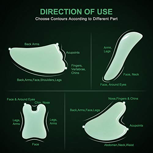 ❤GUIDANCE BOOKLETS & FULL-BODY MASSAGE – 4 guasha boards with different shapes and sizes aiming to offer you complete massage including keep young on face,shoulders,thighs, tight calves,back belly waist etc. All double beveled edges are smooth and slightly rounded ,so never scratch and hurt your skin even when doing trigger point. INSTRUCTIONS BOOK can help you use them better especially for beginner.