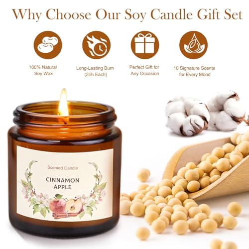 【10 Premium Soy Candles with Relaxing Scents】- Each candle is made with 100% natural soy wax and a cotton wick for a clean, even burn. Enjoy cozy fragrances like Lavender, Vanilla, Lemongrass, and Cinnamon Apple, blended with other natural scents that fill your home with warmth and comfort all winter long.