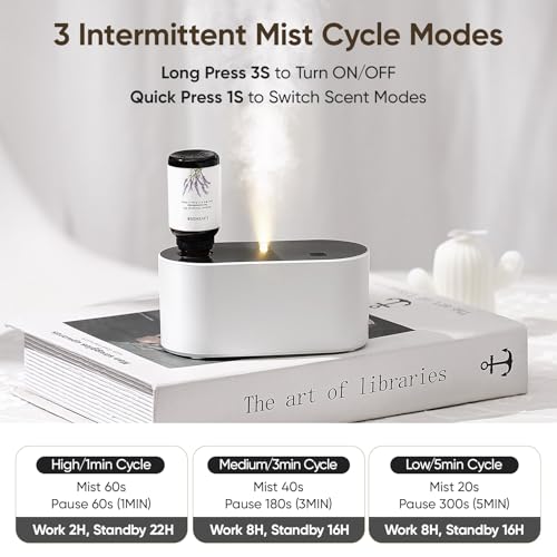 Specification: Waterless Diffuser for Essential Oil, Battery Operated Scent Air Aromatherapy Diffuser, Mini Aroma Diffusers with 3 Intermittent Mist Modes, Cycle Start for 400-700 sq.ft Home Office Bedroom