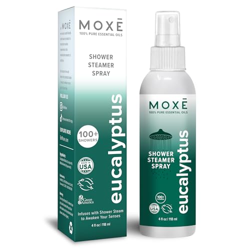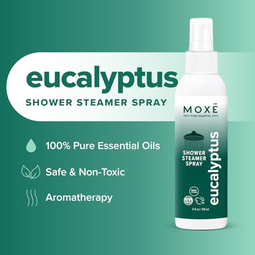 MOXĒ Eucalyptus Oil Shower Mist, Spa Steam Spray, Certified Natural 100% Essential Oils, Made in USA, Aromatherapy, Sinus Congestion Relief, Tension Relief, 4 Ounces