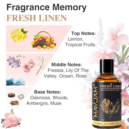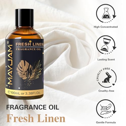 Specification: MAYJAM 100ML/3.38FL.OZ Fresh Linen Fragrance Oils with Glass Dropper, Essential Oils for Diffusers for Home, Long Lasting Scented Oils for Diffusers Soap Candle Making