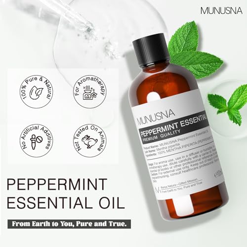 Invigorating Peppermint Essential Oil: Fresh, sharp, cool, herbal, slightly sweet. MUNUSNA 100% natural peppermint oil is steam-distilled from fresh Mentha x piperita leaves, undiluted, no additives, no fillers. Peppermint essential oil is revitalizing, invigorating and cooling with a fresh, strong mint scent that is energizing and uplift your well-being routines
