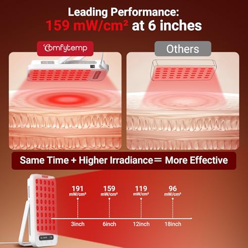 Powerful Red Light Therapy for Home Use: Say goodbye to expensive salons and spas-easily enjoy the benefits of red light therapy right at home. The key to its benefits lies in light intensity: the higher the intensity, the shorter time it takes to achieve results. Our red light therapy panel boasts an impressive intensity of 159 mW/cm² at just 6 inches, far exceeding similar products on the market. Using our panel just 10 minutes equals using ordinary products for 20 mins.
