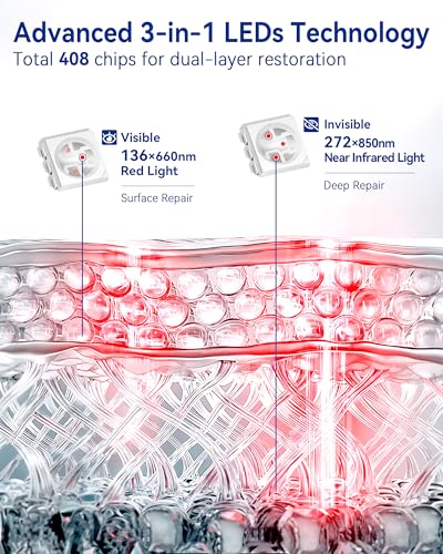 [136-LED Dual Wave — Target Skin & Deep Tissue] KingPavonini red light therapy lamp with 136 LEDs, 3-in-1 chips (total 408 chips). 660nm red for surface skin + 850nm infrared for deeper layers — these two wavelengths work in synergy to support smoother-looking skin, promote circulation, ease tension, relax overworked muscles and joints after workouts or a long day, and encourage more restful sleep